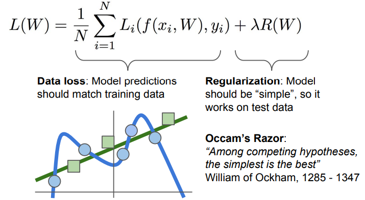 따라서 Data loss와 Regularization loss라는 두 항을 가진 손실 함수가 완성되었다. 이때 는 하이퍼 파라미터이며 과 트레이드오프(trade off) 관계이다.