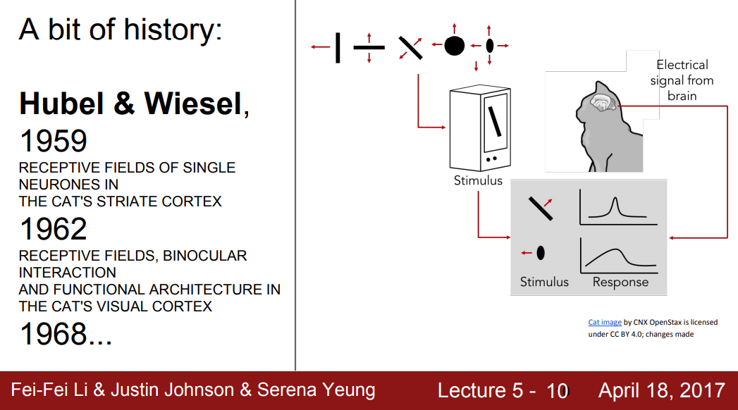 - 해당 연구는 고양이의 뇌에 전극을 꽂고 다양한 자극을 주는 실험이 진행되었다. 그 결과 뉴런이 oriented edges와 shapes에 반응한다는 사실을 알게 되었다.