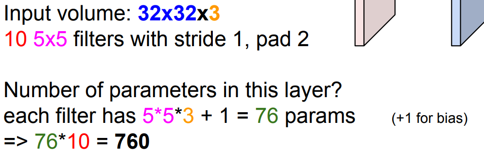 - 한 activation map의 parameter 개수는 Weight+Bias=5∗5∗3+1=76이고, 10개의 필터가 있으므로 76∗10=760이 된다.