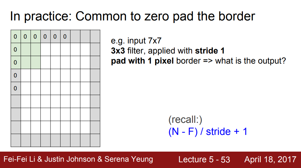 - Input이 7x7인 경우 stride 2에서 3x3 output activation map이 생성되지만, stride 3에서는 정수로 나누어 떨어지지 않으므로 activation map을 생성할 수 없다.