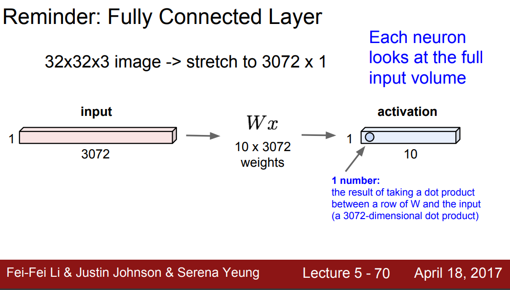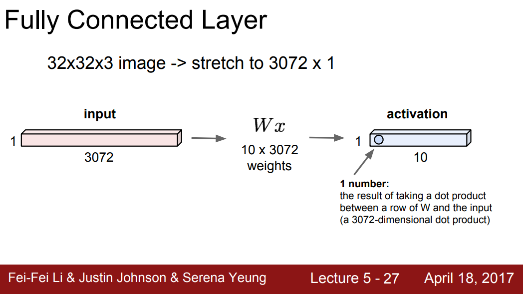 - 벡터를 가지고 연산하므로 입력값으로 들어온 32x32x3 이미지를 3072차원의 벡터로 변환한다. (32x32x3 image -> stretch to 3072x1)