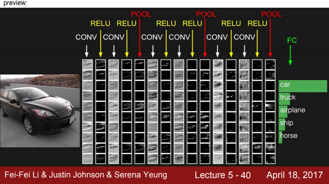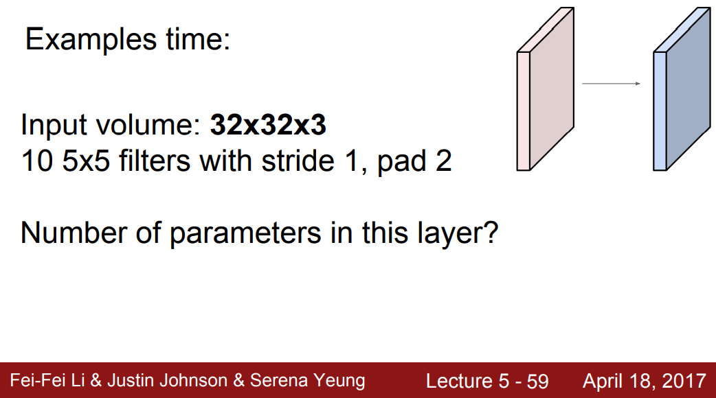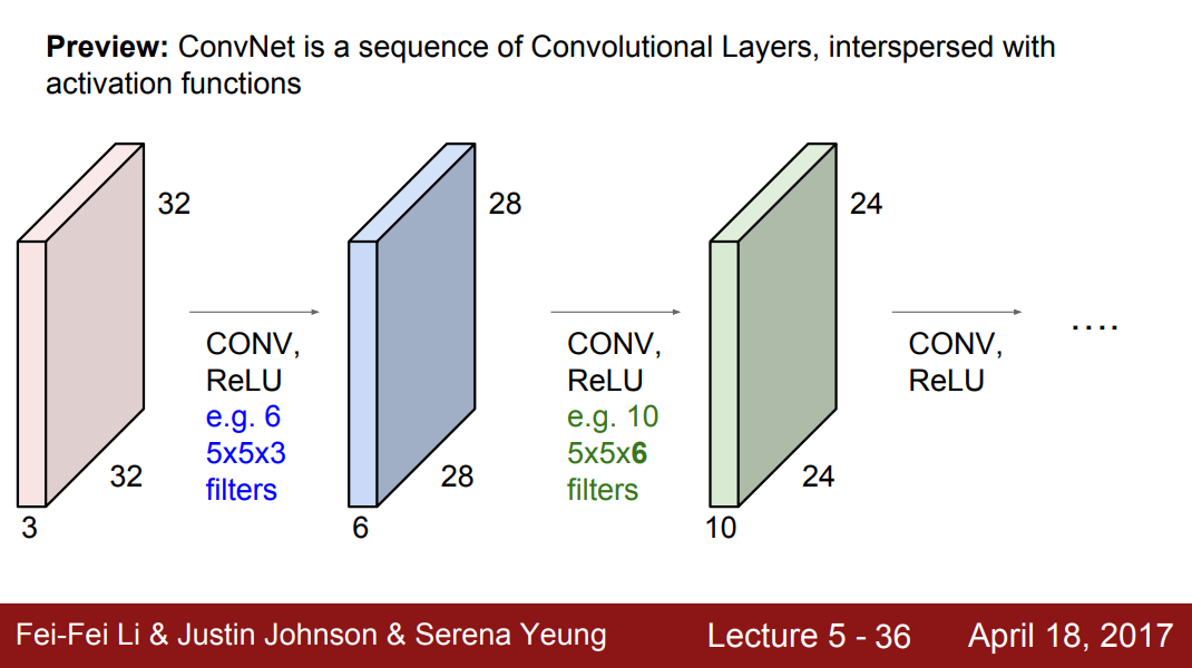 - 32x32x3의 spatial structure을 가진 image, 5x5x3 filter 6개 -> 28x28x6 size activation map이 생성되었다.