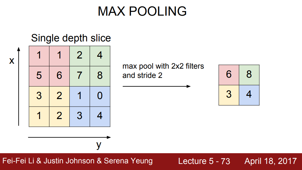 - 주로 Max Pooling을 사용한다. 위와 같이 각 구역 별로 최댓값을 찾고, 나머지 값은 버려 크기를 줄일 수 있다.