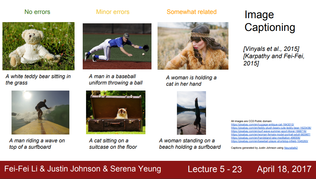 - image captioning : Classification과 Detection에서 좀 더 나아간 방법으로 주어진 이미지에 대한 설명을 문장으로 만들어내는 기능이다.