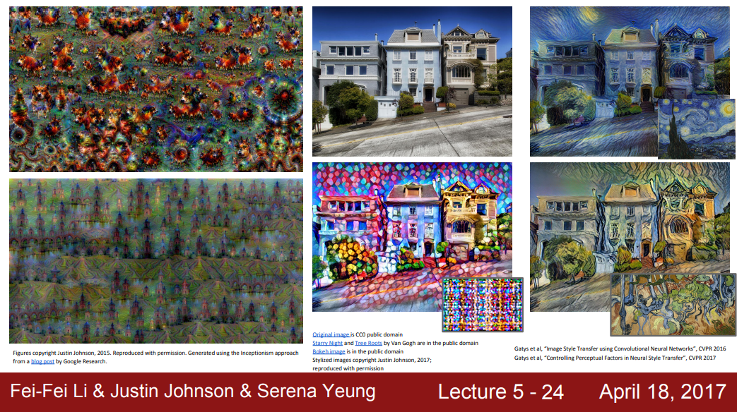- NN을 이용해 예술작품을 만들 수 있다. 원본 이미지를 기반으로 특정 화풍으로 다시 그려주는 알고리즘도 존재한다.