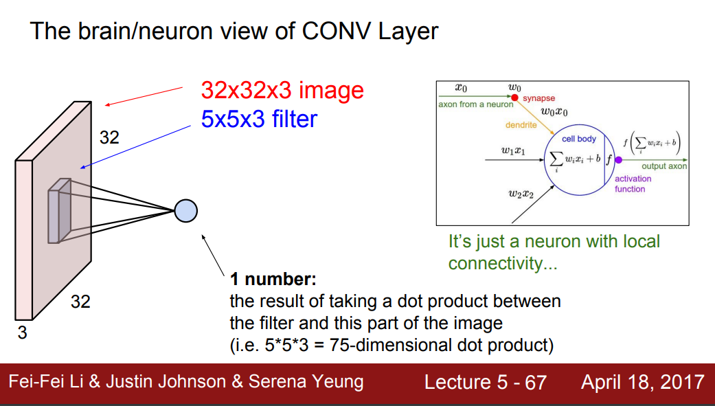 - 하나의 필터 영역 연산에 대해서는 1개의 숫자 output이 나오는데, 이것은 뉴런의 local connection과 유사하다.