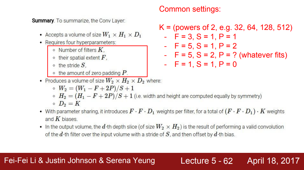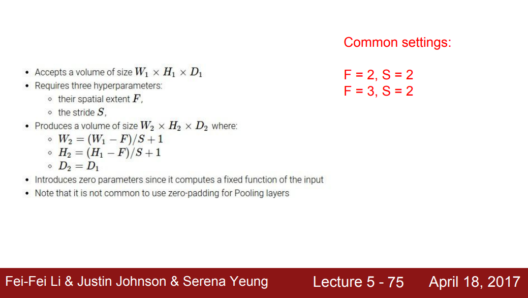 - Pooling layer에 대한 요약으로, 보통 필터의 사이즈에 무관하게 stride 2를 사용한다.
