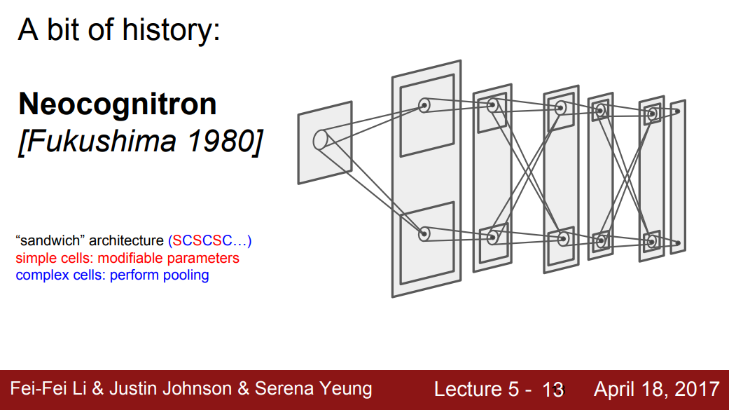 - Hubel과 Wiesel이 발견한 simple/complex cells의 아이디어를 사용한 최초의 NN이다. Simple/complex cells를 교차시켰다. (SCSCSC...)