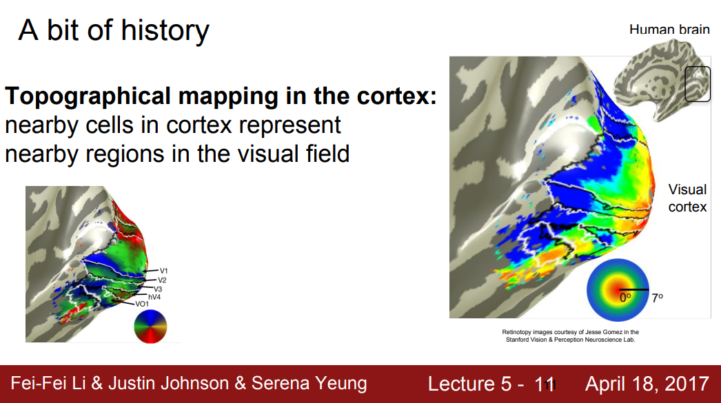 - 피질 내 서로 인접해 있는 세포들은 visual field 내에 어떠한 지역성을 띄고 있다.
