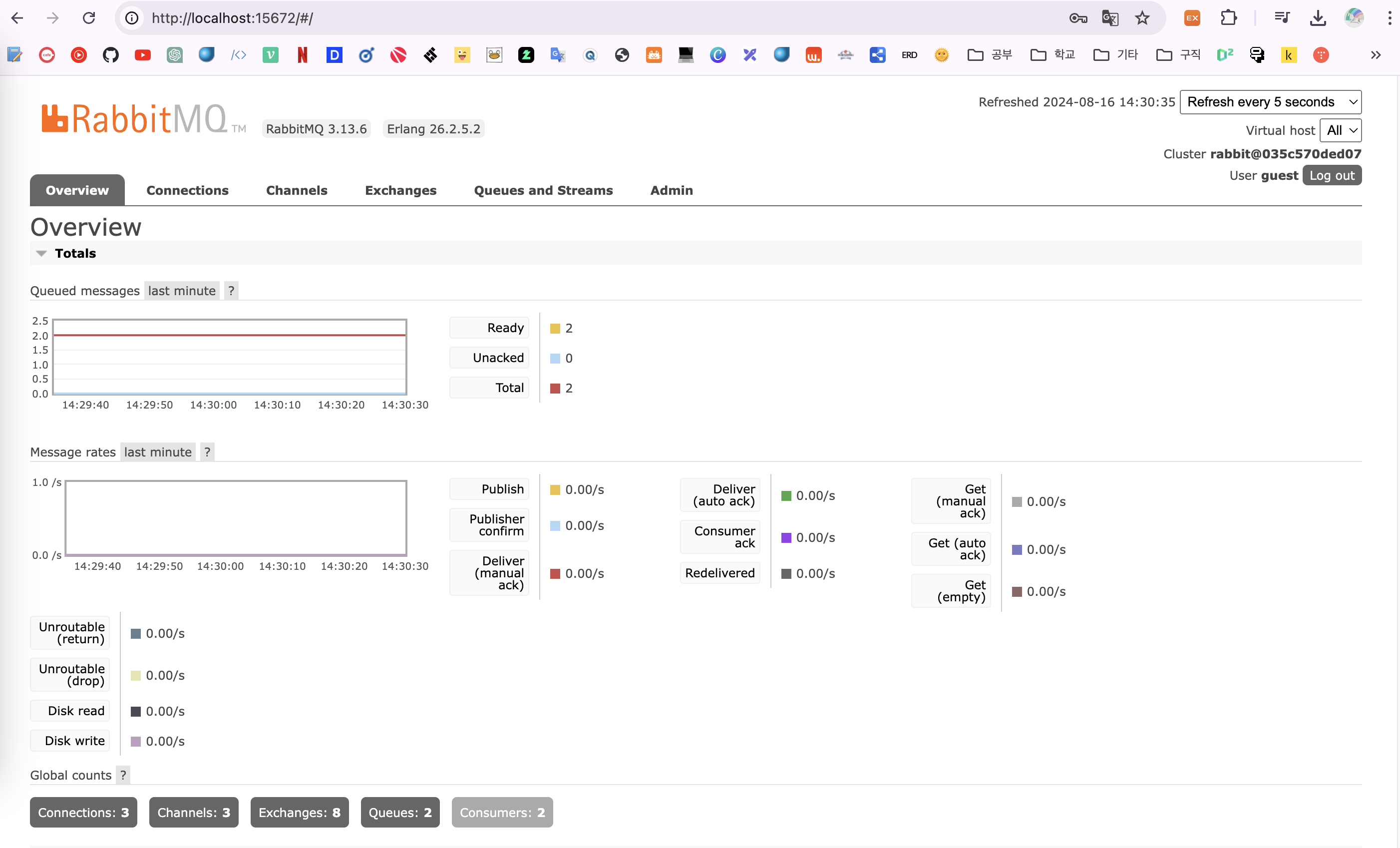 다음 localhost:15672 로 접속하게 되면, 다음과 같은 웹 화면을 확인할 수 있는데 기본 id/password 는 guest/guest 이다.