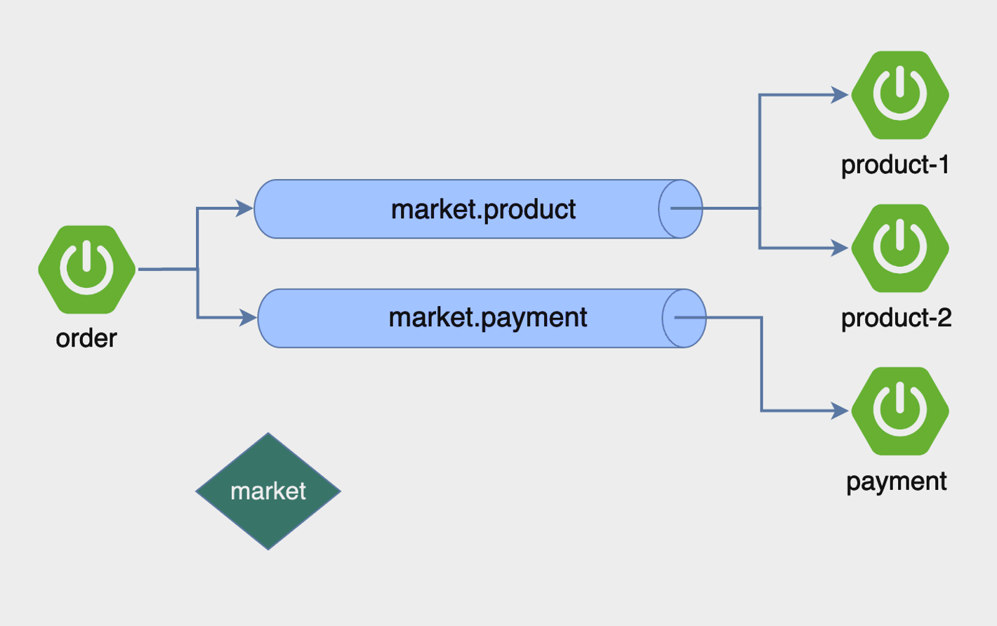 해당 그림에서 처럼 Order 서비스에서 익스체인지를 통해 각 큐로 메시지를 바인딩해주고, product,payment 서비스로 각 큐가 메시지를 전달하는 구조로 이루어져 있다.
