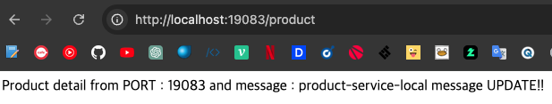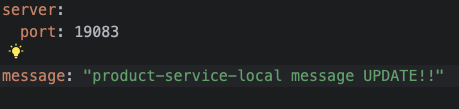 여튼 다시 localhost:19083/product 엔드포인트로 접근해보면, product-service 서버를 다시 재시작 하지 않고도, yml 파일의 값 변경을 확인하고 적용하는 모습을 보여준다.