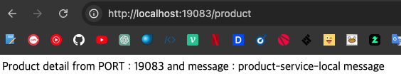 localhost:19083/product 로 접근해 보면, product 서버의 포트인 0 번과 default 메시지가 아니라 config 서버에서 지정해준 19083 포트에 product-service-local message 가 뜨는 것을 확인할 수 있다.