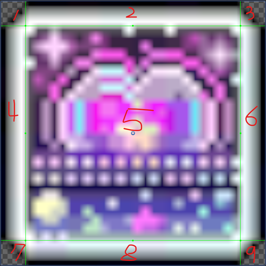 이미지를 9개로 분할하여 1,3,7,9의 영역은 크기를 변경하지 않고 유지하며 2,8 영역은 가로로 늘리고 4,6 영역은 세로로 늘립니다. 나머지 5 영역은 가로 세로 모두 늘립니다.