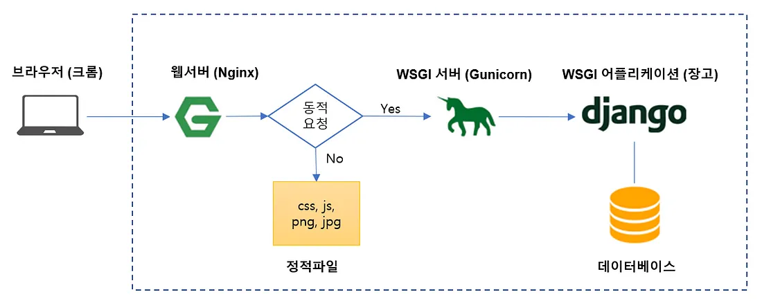 👉 그래서 Nginx는 보안, 성능, 정적 파일 처리 등을 맡고, WSGI 서버는 실제 파이썬 애플리케이션 실행을 담당하는 구조가 일반적입니다.