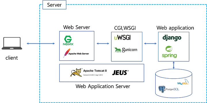 WSGI 서버는 그 중간 연결 통로(미들웨어) 역할을 합니다.