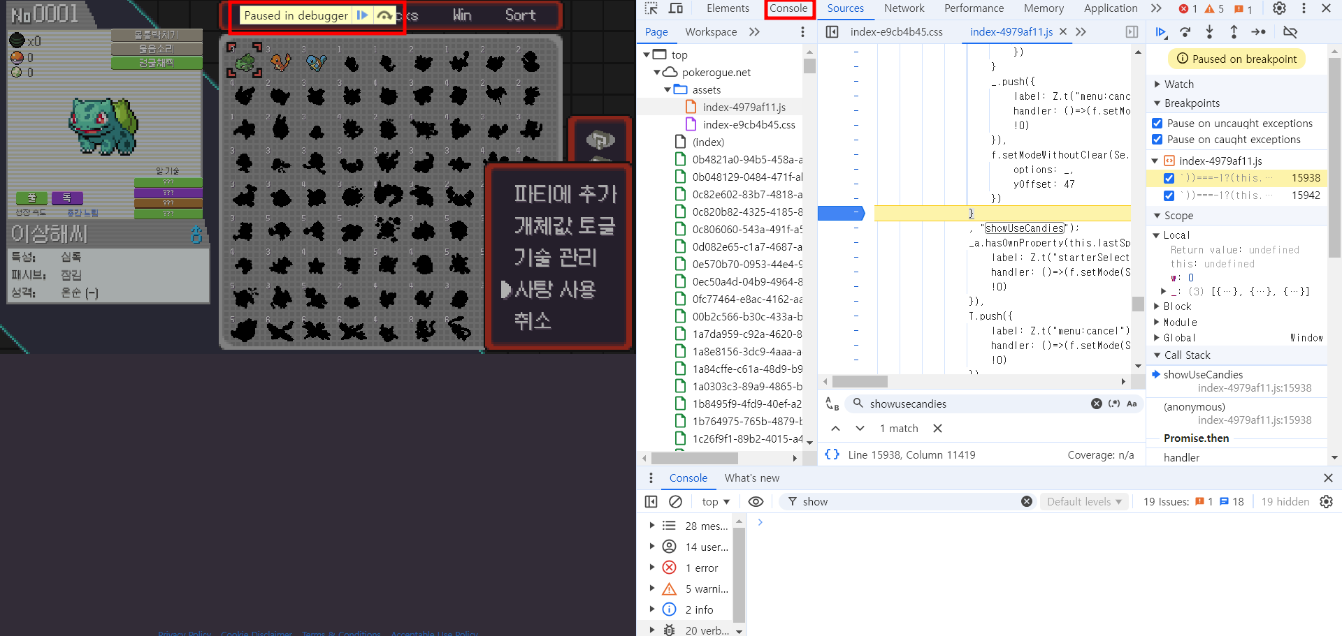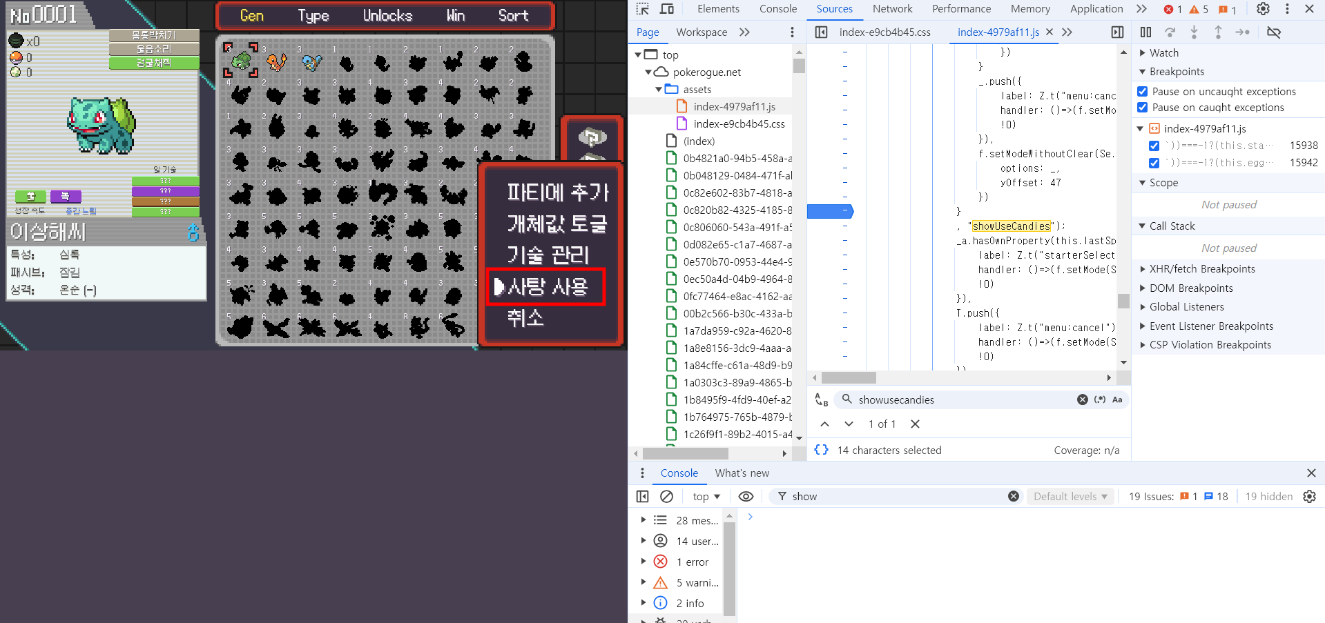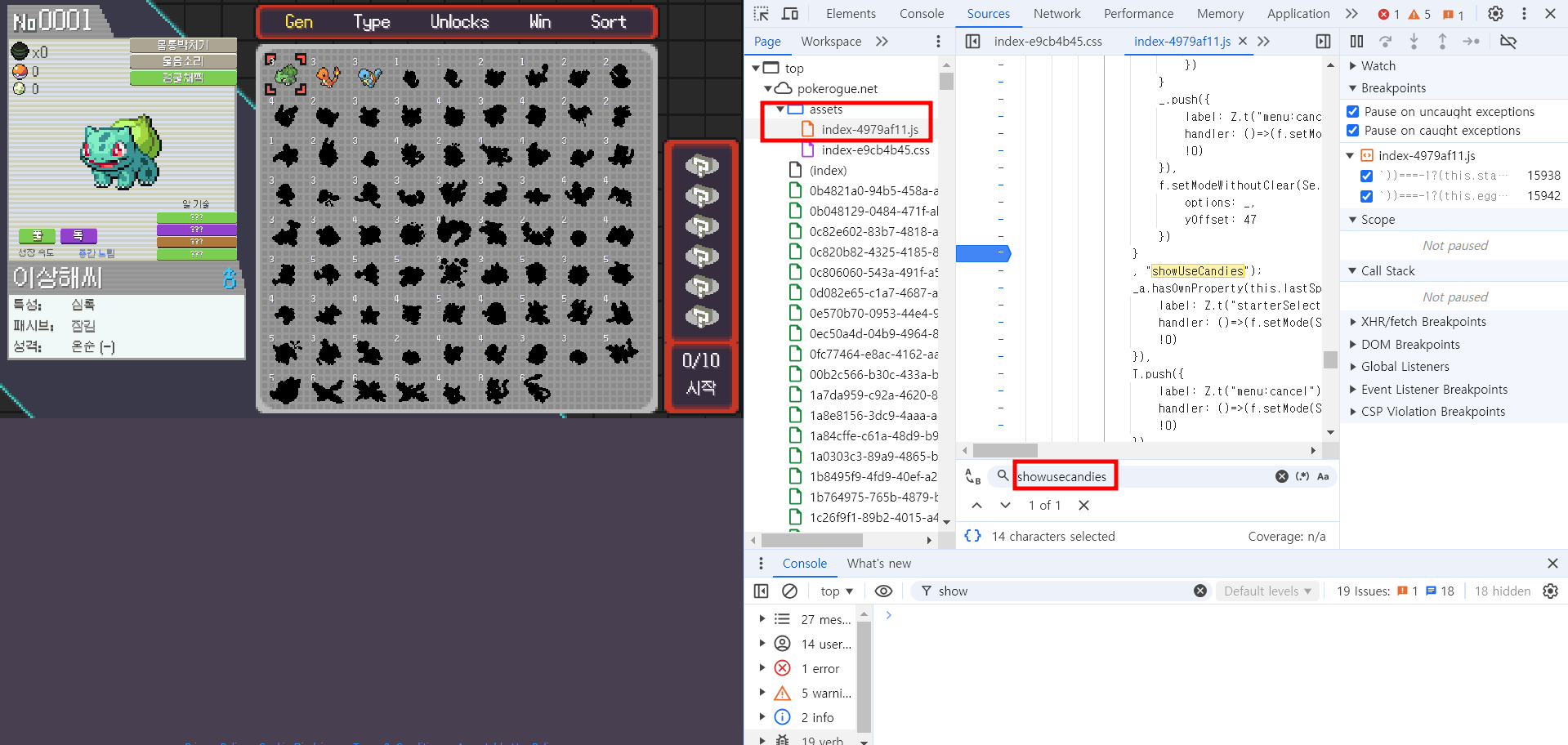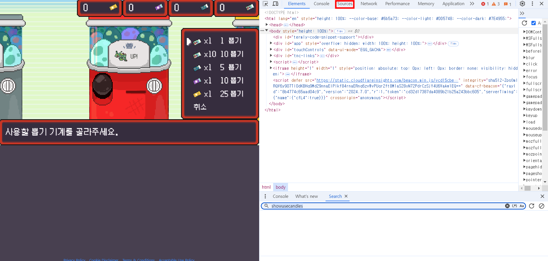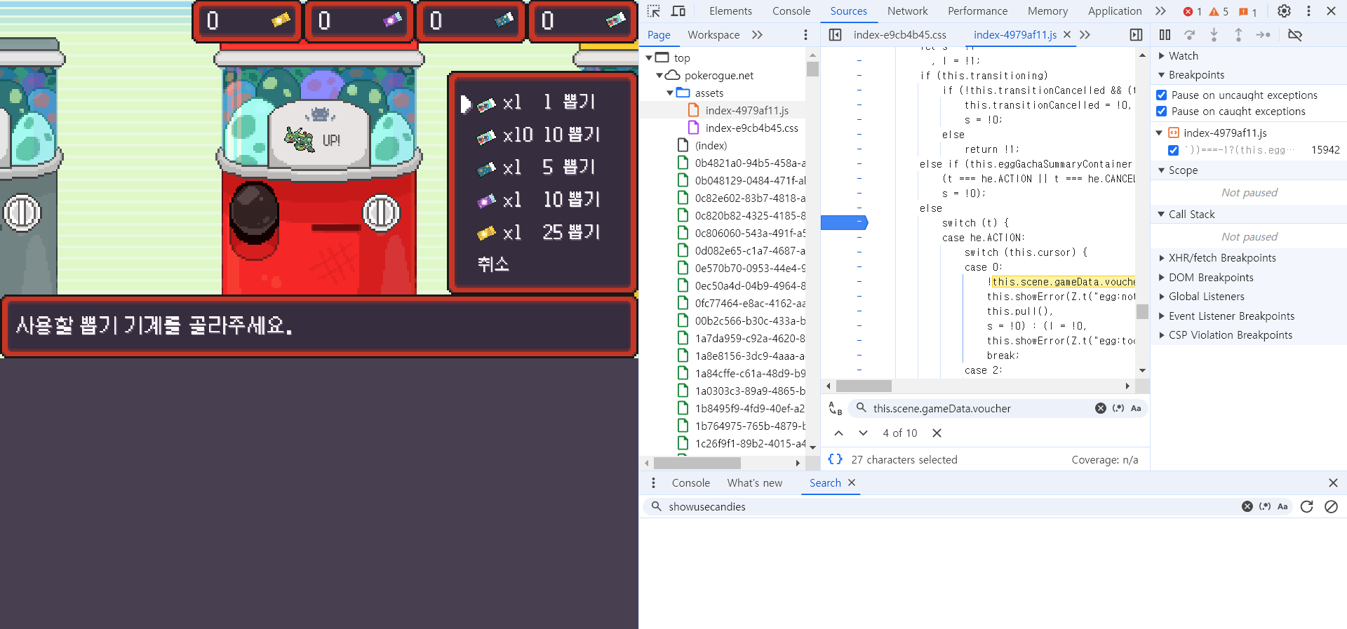 개발자도구 source에서 showusecandies를 검색하고 사진과 동일한 위치에 중단점 클릭