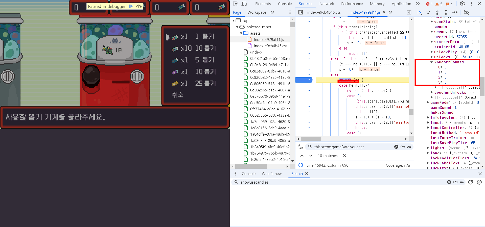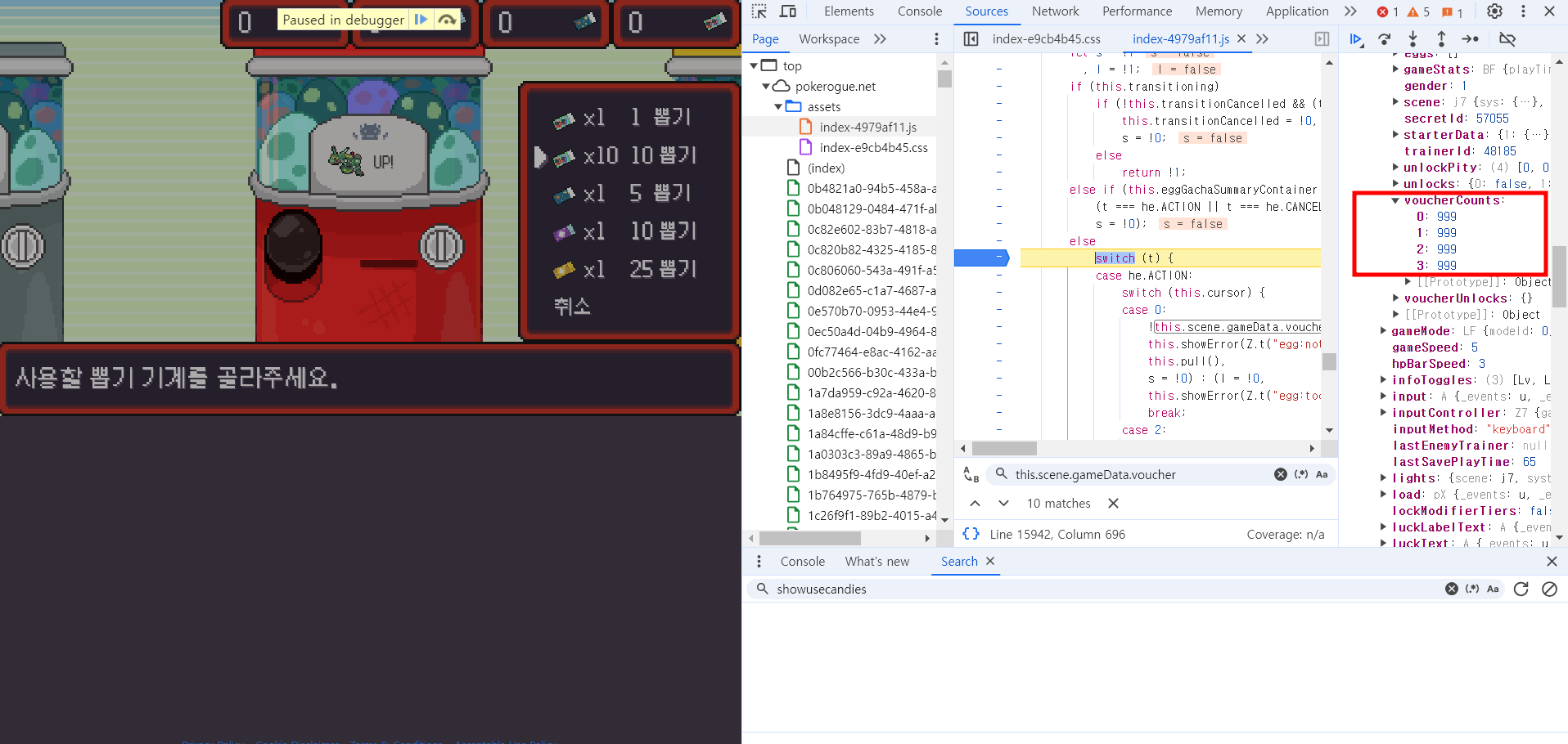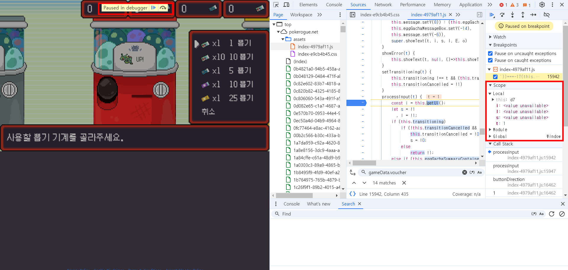 개발자 도구 좌측 page에서 assets-index-4979af11.js 클릭, Ctrl + f로 검색창 활성화, gameData.voucher 검색(대소문자 구분주의) 후 4번째 검색결과로 이동하여 사진과 동일한 중단점을 클릭한다. 이후 게임화면에서 아무방향키를 눌러 디버거를 일시정지하고 개발자 도구 우측 Scope에서 this-scene-game data-voucher counts 순으로 클릭하고나서 voucher Count의 4개의 파라미터 값을 더블클릭해 모두 999로 변경한다.