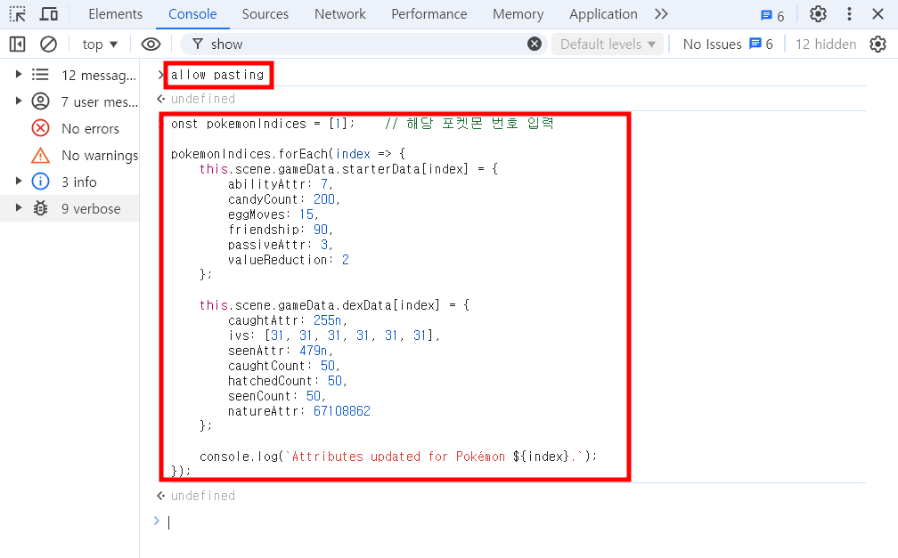 개발자도구-콘솔 클릭 후 allow pasting 입력 후 엔터, 이후 위 코드 입력(1번은 이상해씨 도감번호) 후 엔터