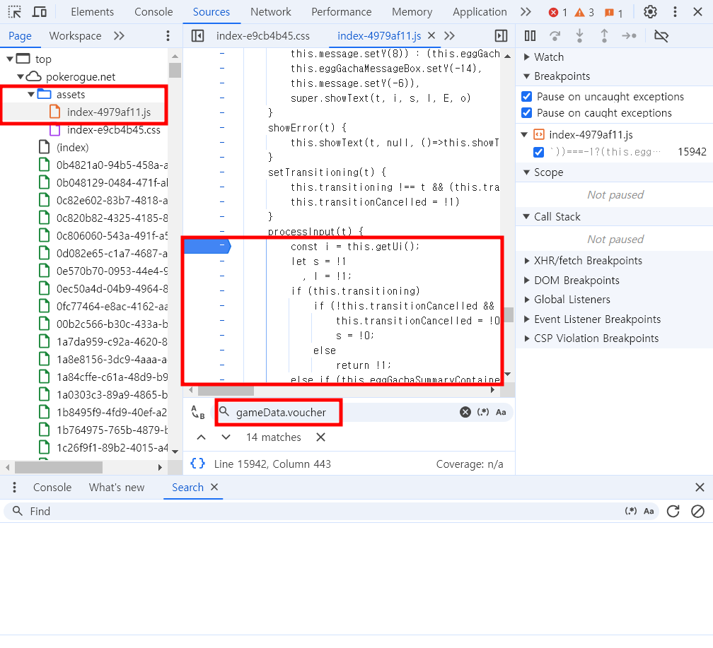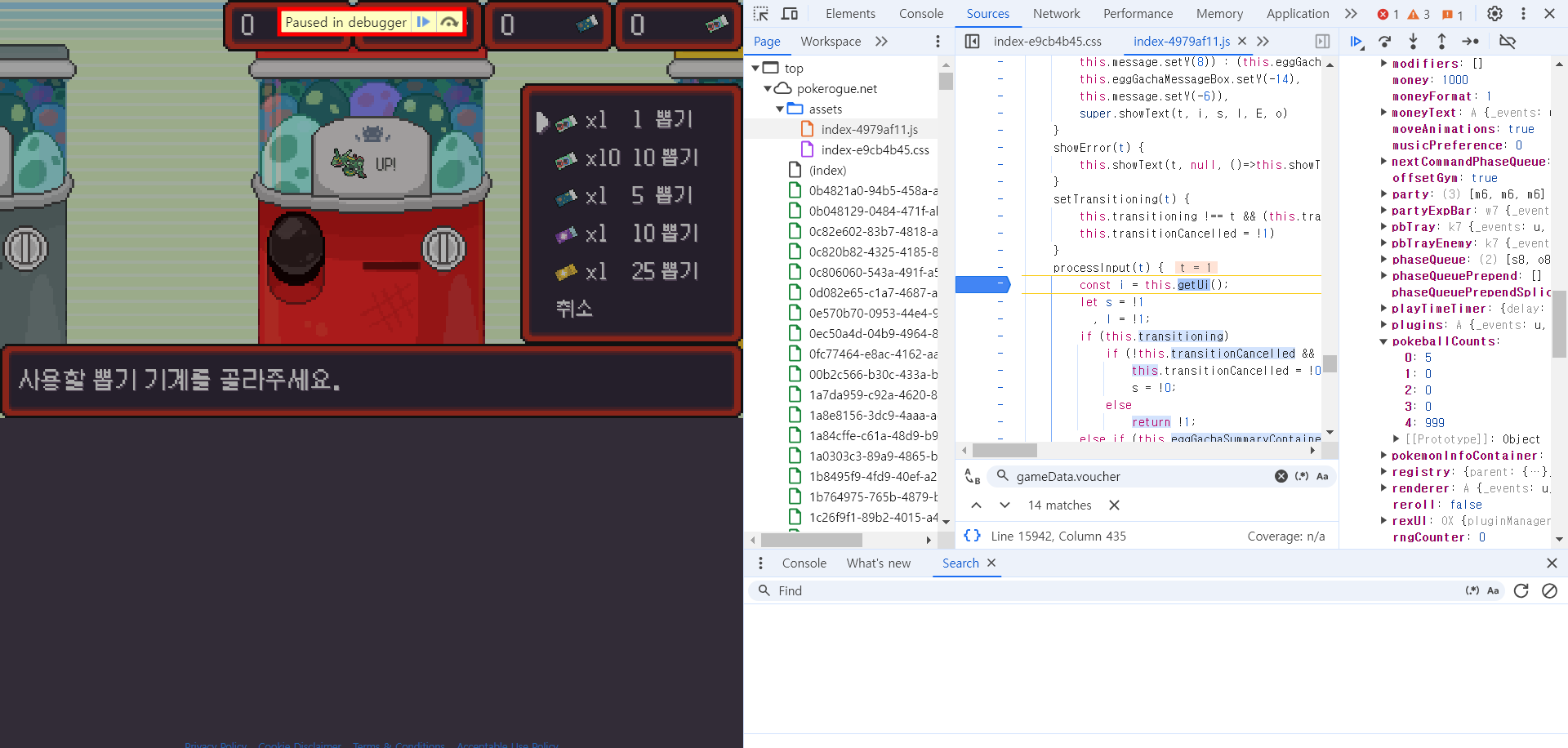 개발자 도구 좌측 page에서 assets-index-4979af11.js 클릭, Ctrl + f로 검색창 활성화, gameData.voucher 검색(대소문자 구분주의) 후 2번째 검색결과로 이동하여 커서를 조금 내려 사진과 동일한 중단점을 클릭한다. 이후 게임화면에서 아무방향키를 눌러 디버거를 일시정지하고 개발자 도구 우측 Scope에서 this-scene-pokeballcounts 순으로 클릭하고나서 pokeballCounts의 4번 파라미터 값을 더블클릭해 999로 변경한다.