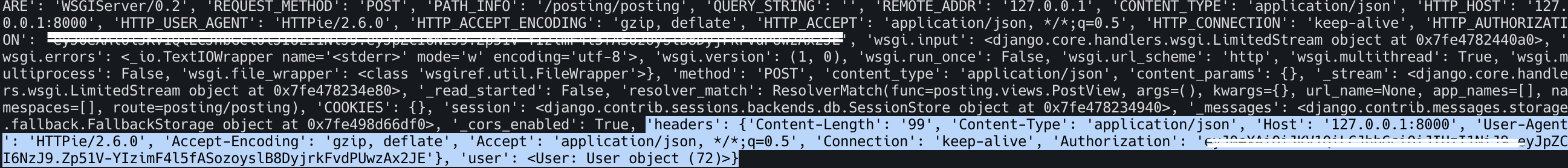 {'request' : {asdfwefsdjkfhweiufhjksldfjoiwejf...} .... 'headers' :{........}, 'user' : <User: User object (72)>}