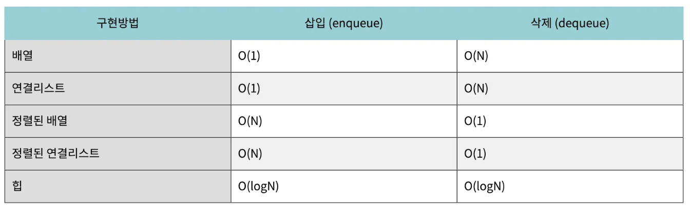 삽입 및 삭제 시 우선순위에 따라 요소들을 정렬해야하기 때문에 주로 힙(Heap) 구조로 구현됨