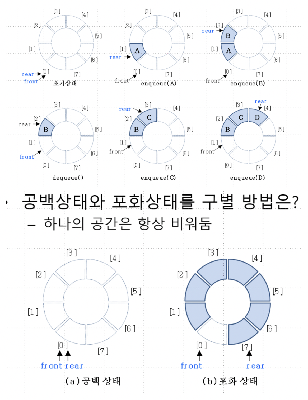 rear가 리스트의 끝에 도달한 후에는 다시 처음 위치에서 빈 공간을 채우며 삽입과 삭제가 일어남 / rear, front 위치계산을 위해 하나의 빈 공간 필요 - 실제 큐의 크기는 큐에서 1을 뺀 크기