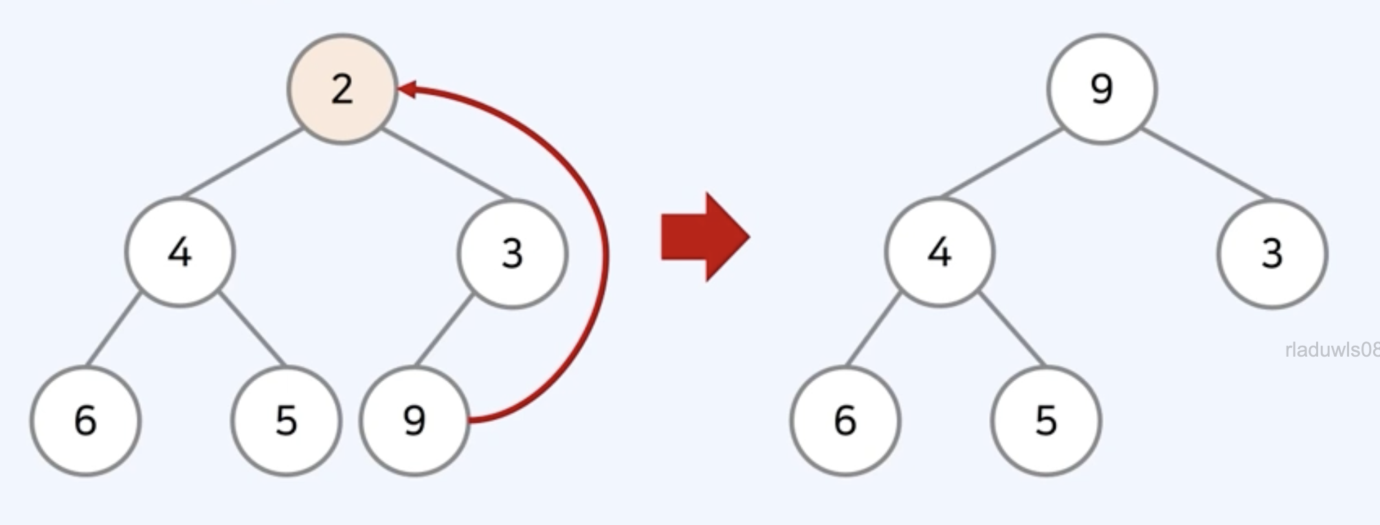 원소 삭제 - 하향식 힙 정렬 (Down-Heapify / Sink-Down): 마지막 노드가 루트 노드에 추가되고 아래로 내려가며 자식노드와 비교해 힙 속성 복구