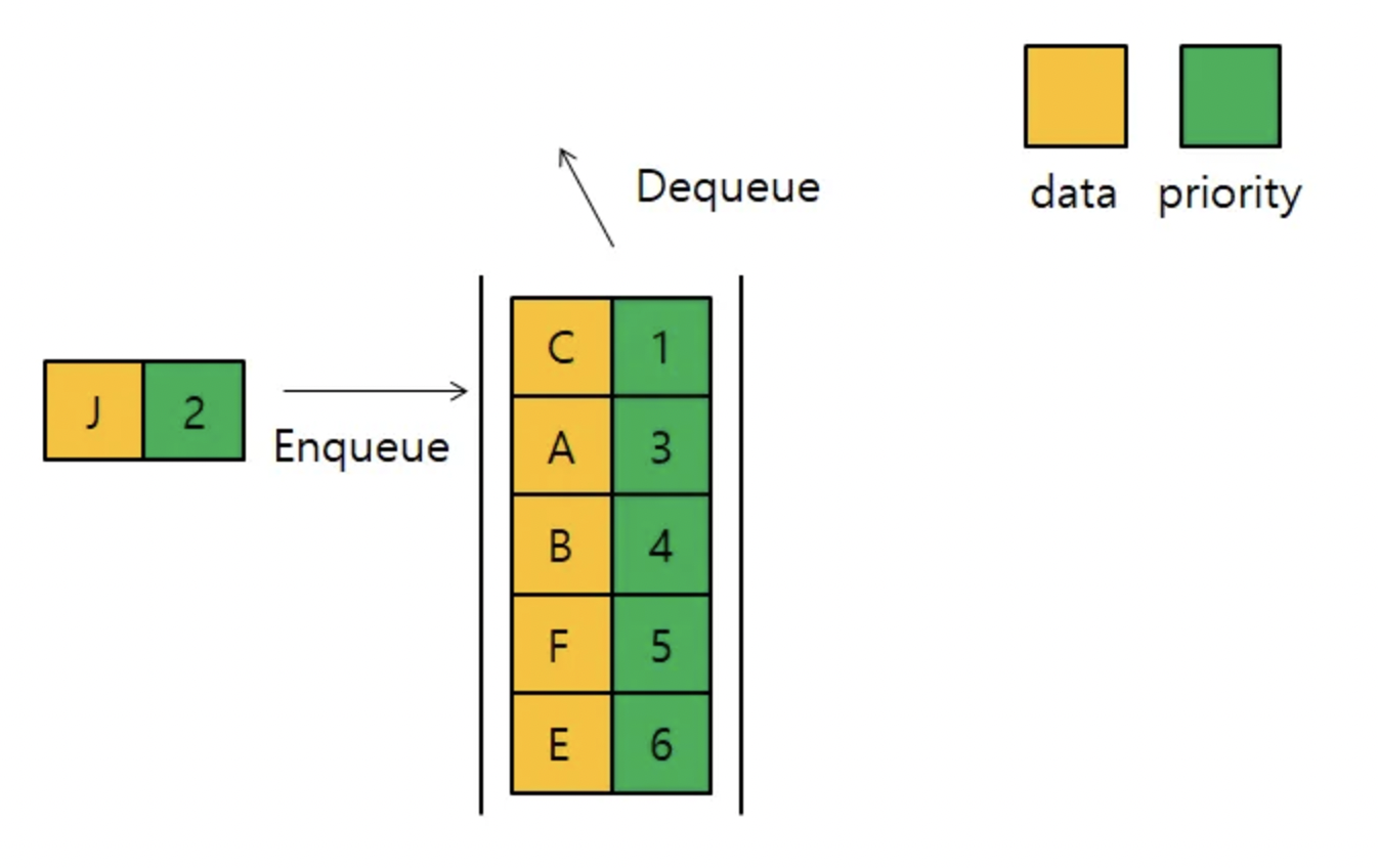 모든 항목에 우선 순위가 있고, 우선 순위가 높은 요소가 낮은 요소보다 먼저 queue에서 제외됨, 두 요소의 우선 순위가 같으면 queue에 들어온 순서에 따라 제외됨