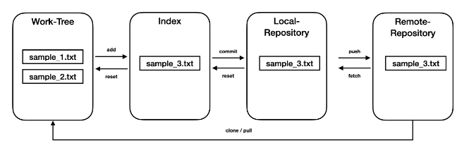 반면git pull은 원격 저장소에서 변경된 정보를 가져와 work-tree에 적용함