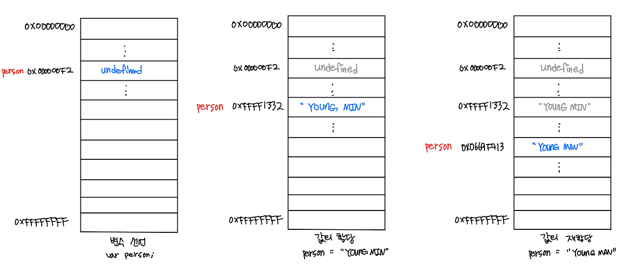 +초기화 단계가 있는 이유는 확보된 메모리 공간에 이전에 다른 애플리케이션에서 사용한 값이 남아있을 수 있는데 (garbage value) 만약 메모리 할당 후 값이 할당되지 않은 상태에서 변수값을 참조하면 쓰레기 값이 나올 수 있음. js는 변수 선언시 암묵적으로 초기화를 해 이런 위험으로부터 안전함