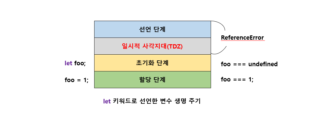 TDZ: 변수 선언 시점(스코프 시작 지점)부터 초기화 시작 시점까지의 구간, 이 구간 중 변수를 참조하면 ReferenceError 발생_초기화 이전이므로 변수에 메모리 공간이 확보되지 않은 상태이기 때문