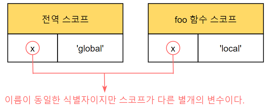 스코프 개념이 없으면 위 코드에서 x 변수가 전역, foo 함수 내에 모두 존재해 충돌할 것임