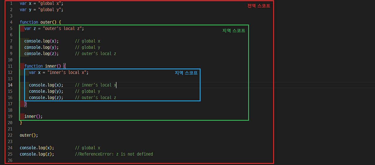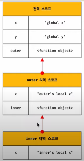 outer 함수가 만든 지역 스코프는 inner 함수가 만든 지역 스코프의 상위 스코프, outer 함수의 지역 스코프의 상위 스코프는 전역 스코프