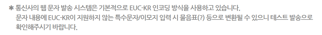 문자 API 명세를 보면 위와 같은 문구가 적힌 것을 확인할 수 있다. 이 문구가 의미하는 것은 통신사에서 실제로 문자를 전송하는 과정에서 EUC-KR 인코딩 방식을 사용한다는 말이다... 하지만 나는 이걸 API 호출 과정에서 EUC-KR 방식으로 인코딩해서 필드에 값을 담아야 한다고 이해했기에 문제가 시작됐다...
