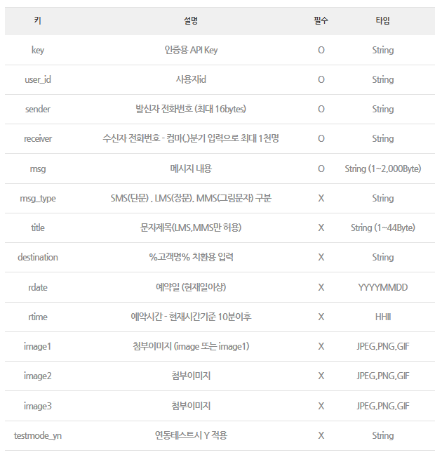 알리고 문자 서비스 사이트를 보면 위와 같이 상세한 API 스펙을 확인할 수 있다. 인증용 API Key, 사용자 ID, 발신자 전화번호, 수신자 전화번호, 메시지 내용 이렇게 5가지 필드가 필수로 들어가야 하는 정보다. 그리고 메시지 API 연동 과정에서 가장 유용하게 사용했던 부분은 바로 testmode_yn 필드이다. testmode_yn 필드에 Y, N을 String 타입으로 입력하면 테스트와 실제 메시지 전송을 선택해서 API를 호출할 수 있었다. 서버에서 자체적으로 테스트를 하는 과정에서도 유용하게 사용했을 뿐 아니라 클라이언트 쪽에서 API 연결 과정에서 호출할 때에도 테스트를 지정해서 호출할 수 있었기에 API 연결이 수월할 수 있었다.