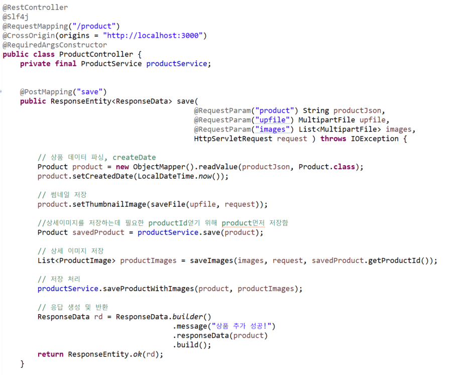 앞단에서 상품정보를 json형태를 띈 문자열로 보냈기 때문에 @RequestParam으로 받을 수 있다. 그리고 ObjectMapper()객체를 이용해 다시 객체로 파싱한 후 썸네일 이미지도 저장한다.