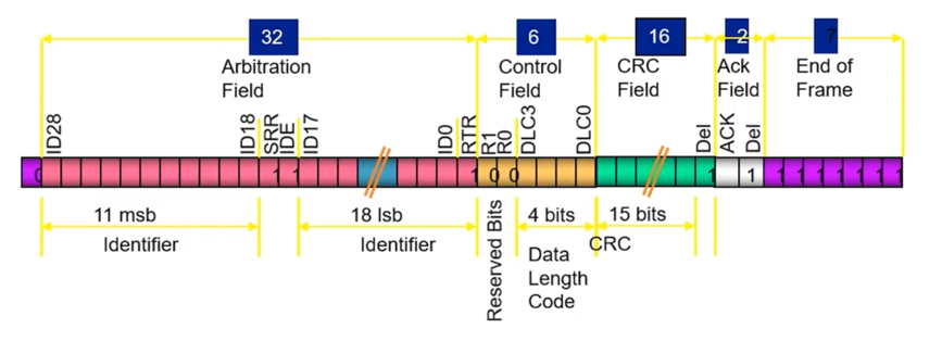 Control Field (제어 필드): 2비트의 IDE(IDentifier Extension) 비트, 4비트의 데이터 길이 코드(DLC, Data Length Code)로 구성된다. RO는 Reserved 비트(Extended CAN 2.0B RO, RI)이다.