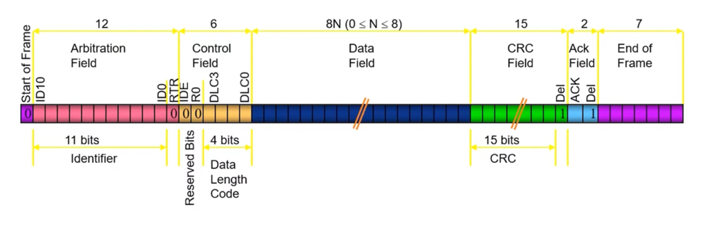 CRC(Cyclic Redundancy Check) 필드: SOF에서부터 데이터 필드까지의 비트열을 이용해 생성한 15비트의 CRC 시퀀스와 하나의 비트의 CRC 델리미터로 구성되어 있다. 이것은 메시지 상의 에러 유무를 검사하는데 사용된다.