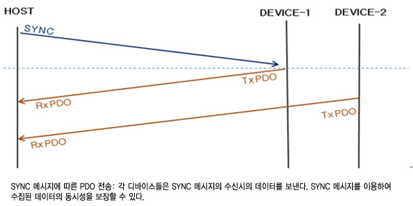 많은 노드에서 매우 빈번하게 PDO가 전송되는 경우 버스 상에서의 충돌의 발생 확률이 높아지고 데이터 수집의 동시성이 보장되지 않으므로 SYNC 프로토콜을 이용하여 데이터의 동시성과 버스 액세스의 효율을 높인다.