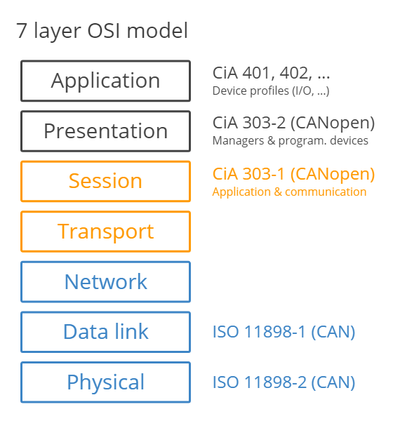 CAN 버스는 두 개의 가장 낮은 계층(1: 물리적, 2: 데이터 링크)을 나타낸다. 이는 CAN이 11비트 CAN ID , 원격 전송(RTR) 비트 및 64 데이터 비트(상위 계층 프로토콜과 관련된 필드)를 사용하여 프레임 전송을 간단하게 가능하게 한다는 것을 의미한다.