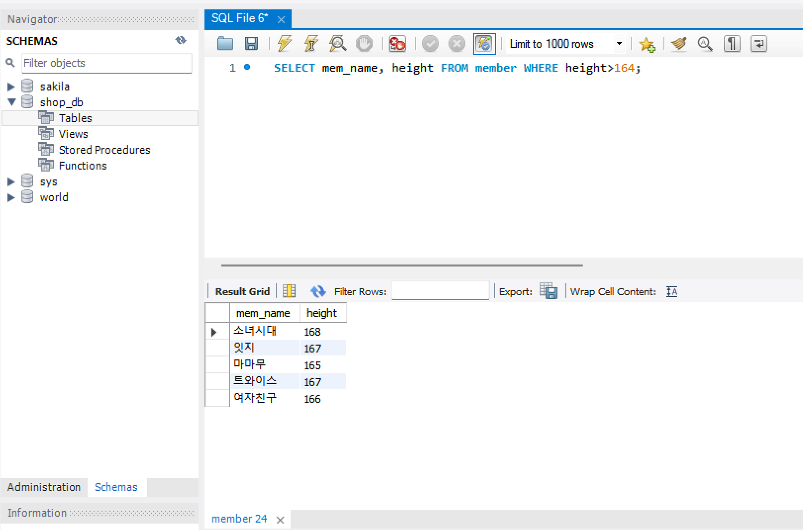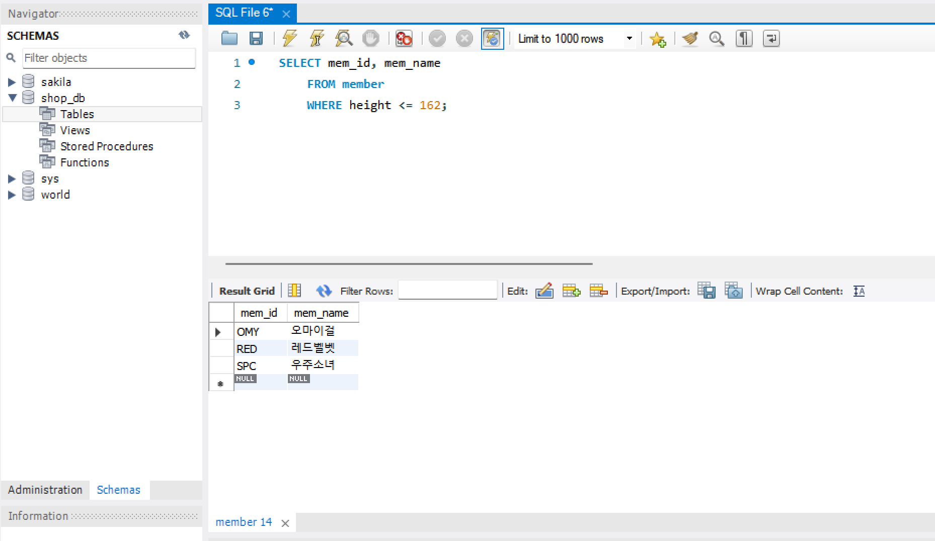 1) 평균 키가 162 이하인 회원을 검색하려면 <= 이라는 관계 연산자를 사용하여 조회할 수 있음.