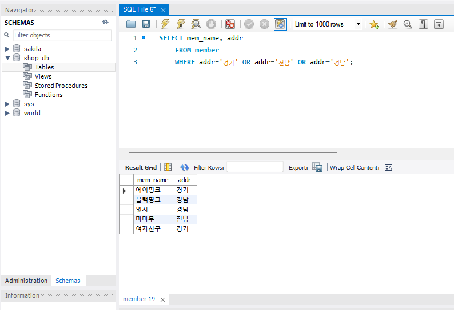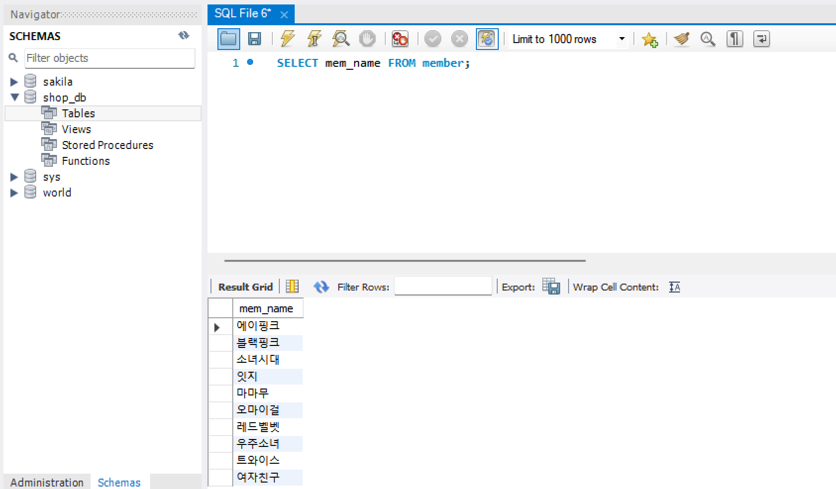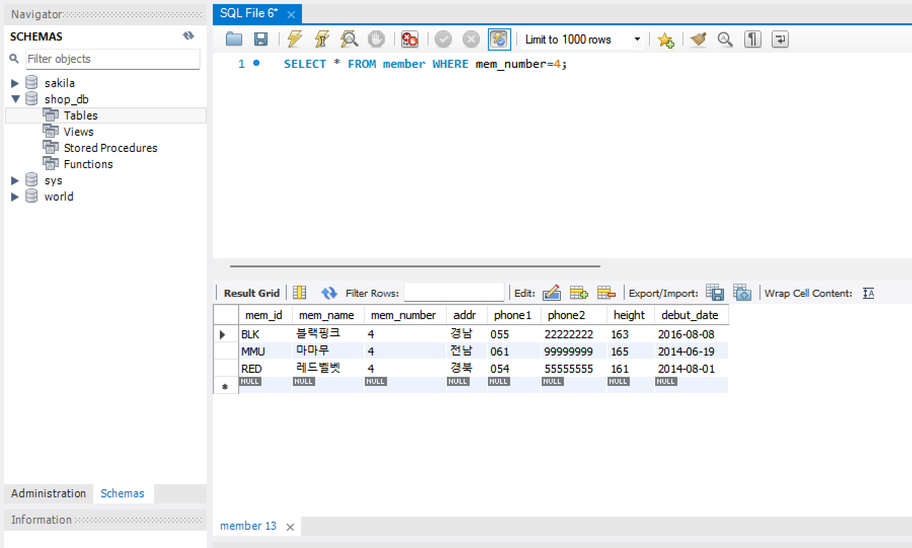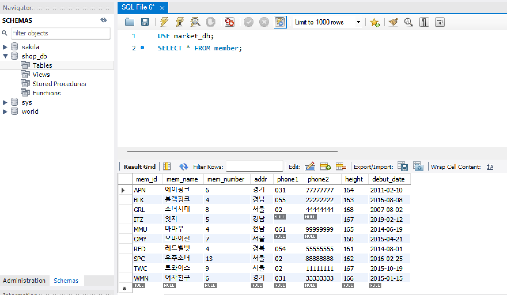 2) SELECT * FROM market_db.member;와 SELECT * FROM member은 동일한 것이 됨. (후자의 것은 사전에 USE market_db;를 사용했으므로)