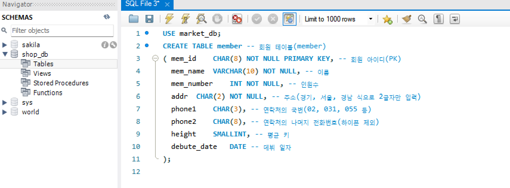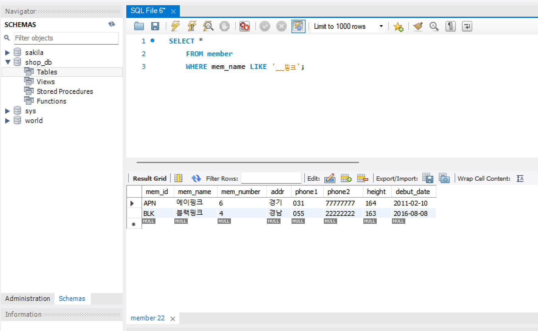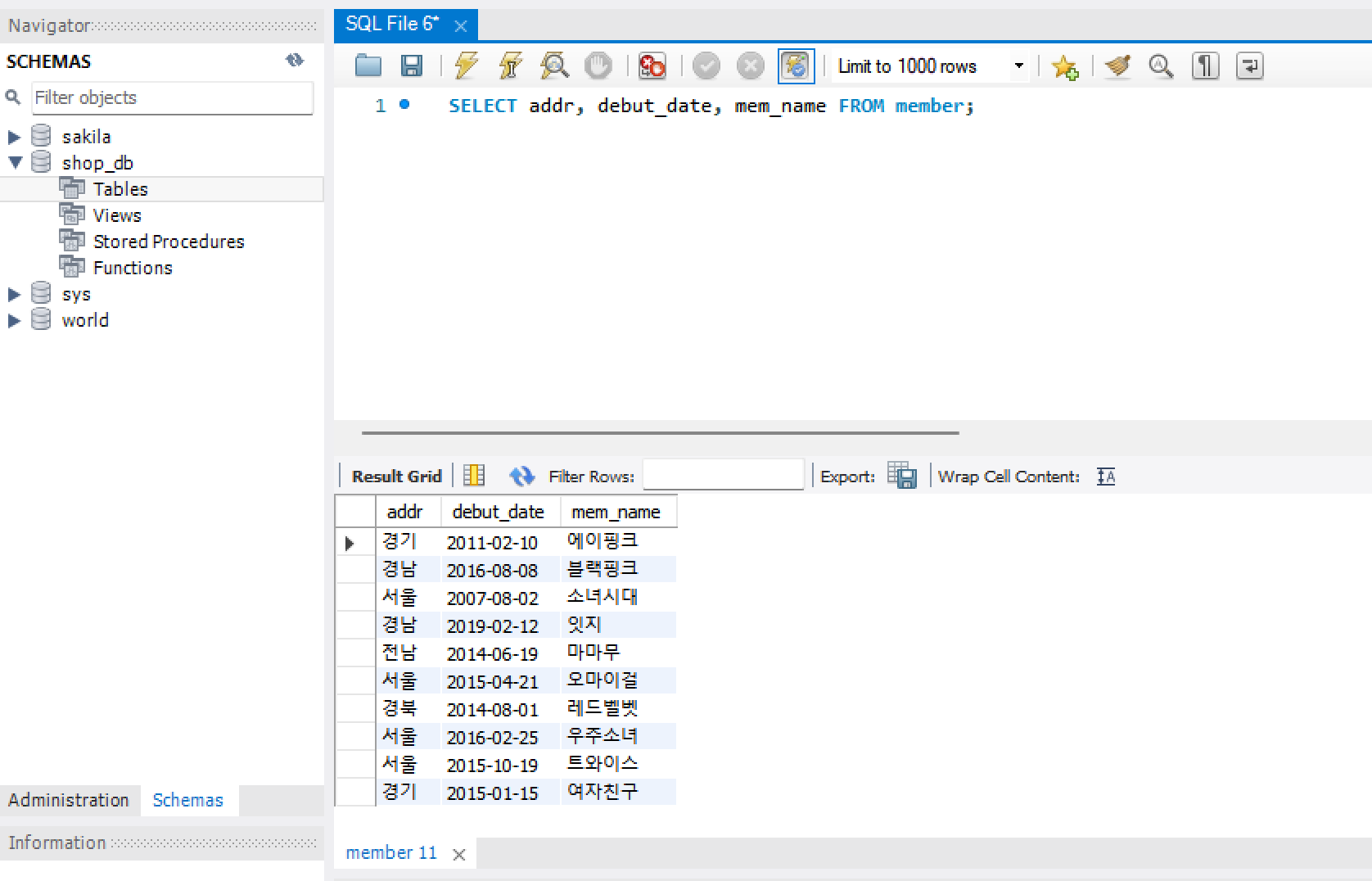 2) SELECT * FROM market_db.member;와 SELECT * FROM member은 동일한 것이 됨. (후자의 것은 사전에 USE market_db;를 사용했으므로)