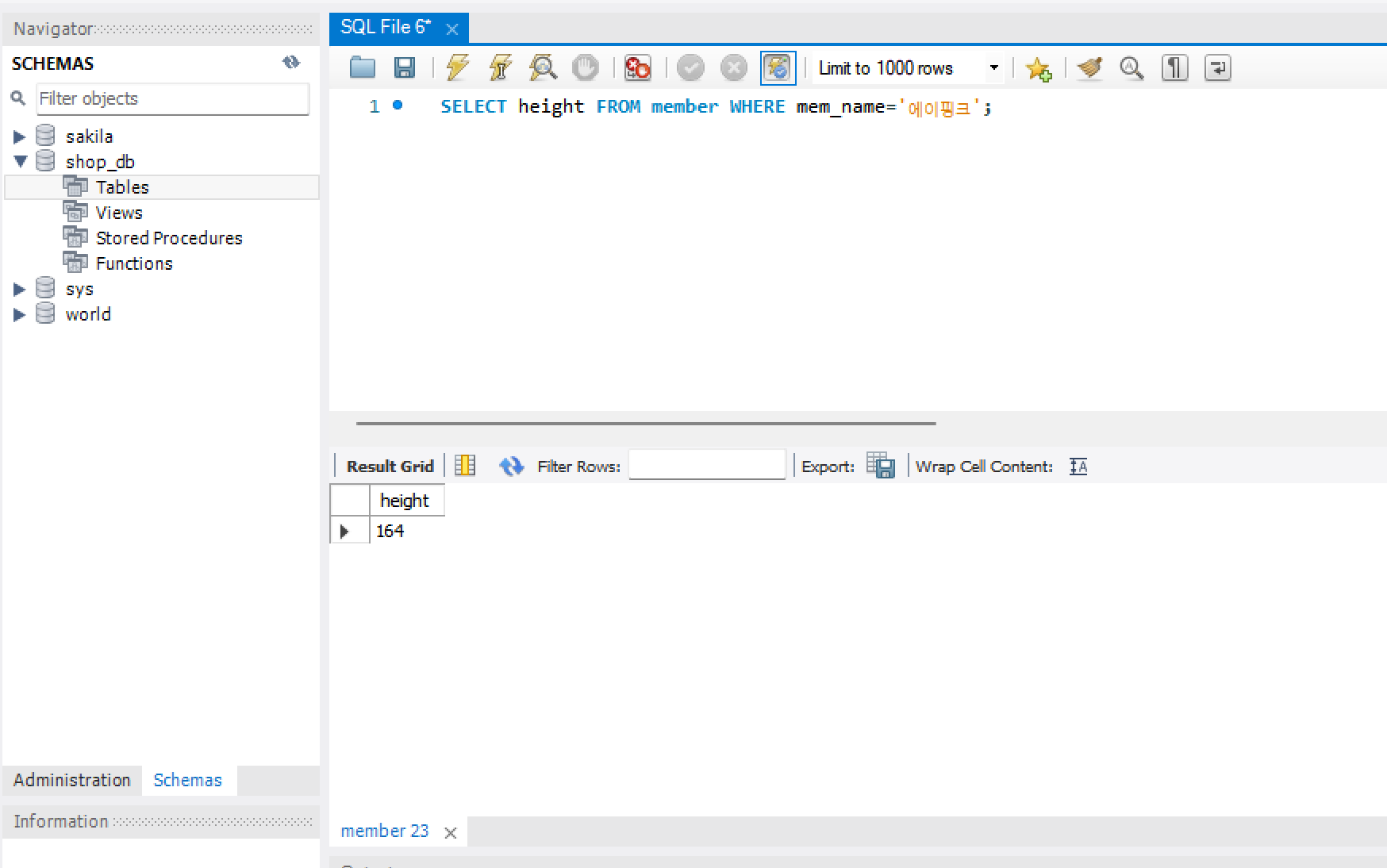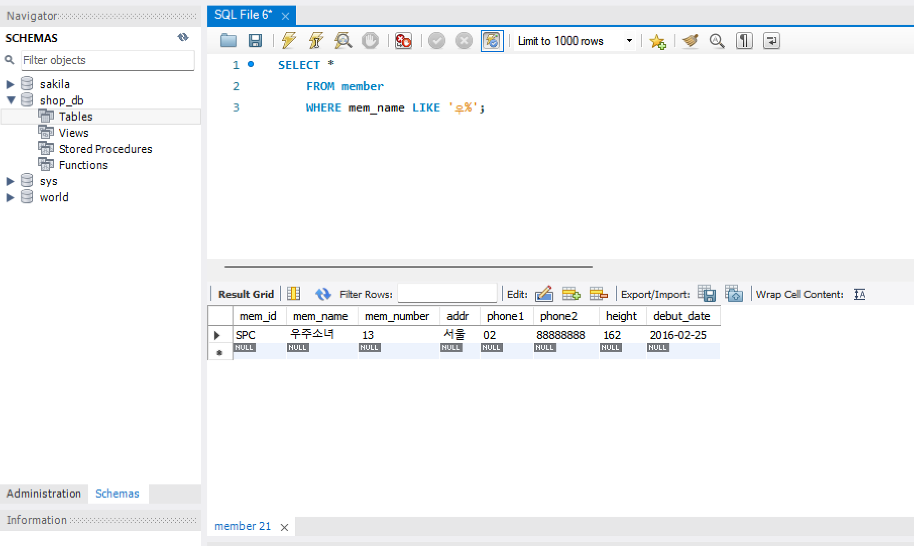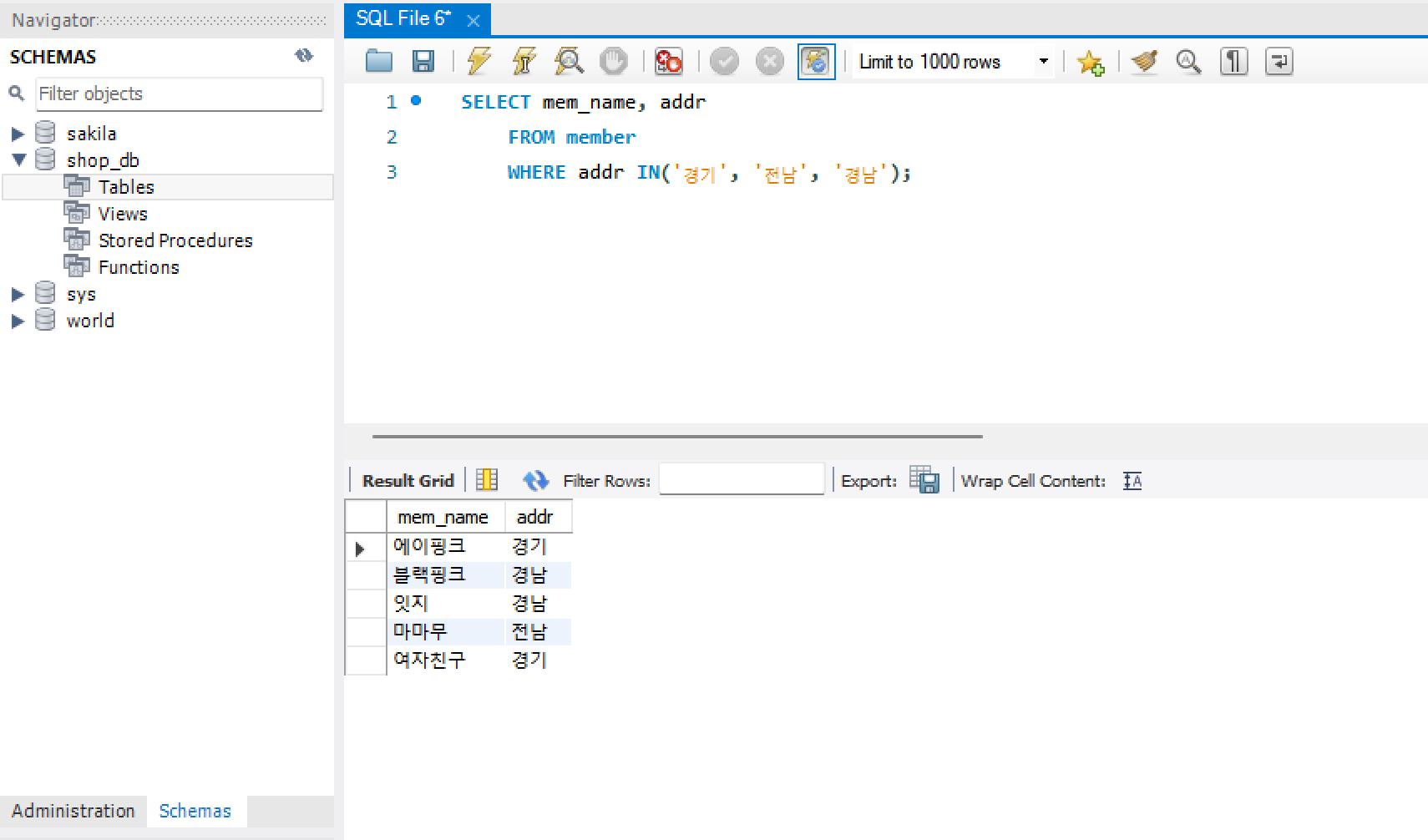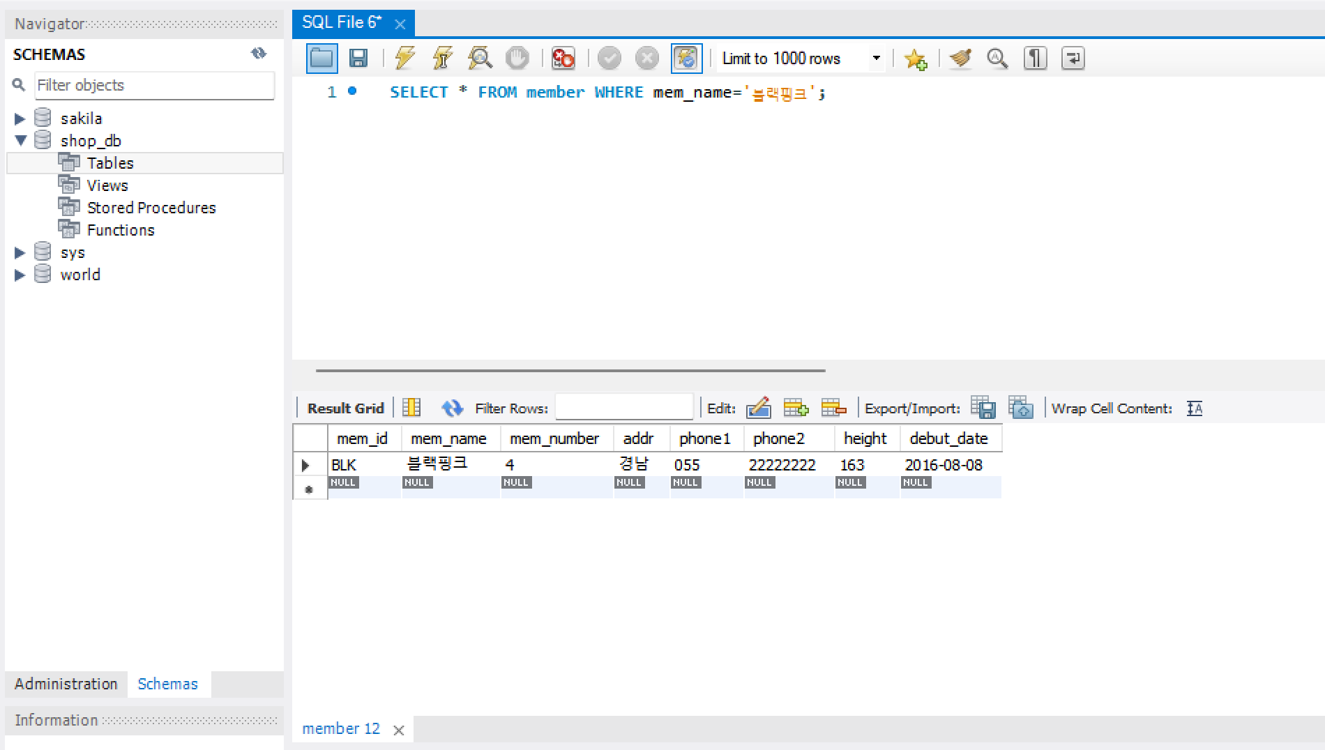 2) SELECT * FROM market_db.member;와 SELECT * FROM member은 동일한 것이 됨. (후자의 것은 사전에 USE market_db;를 사용했으므로)