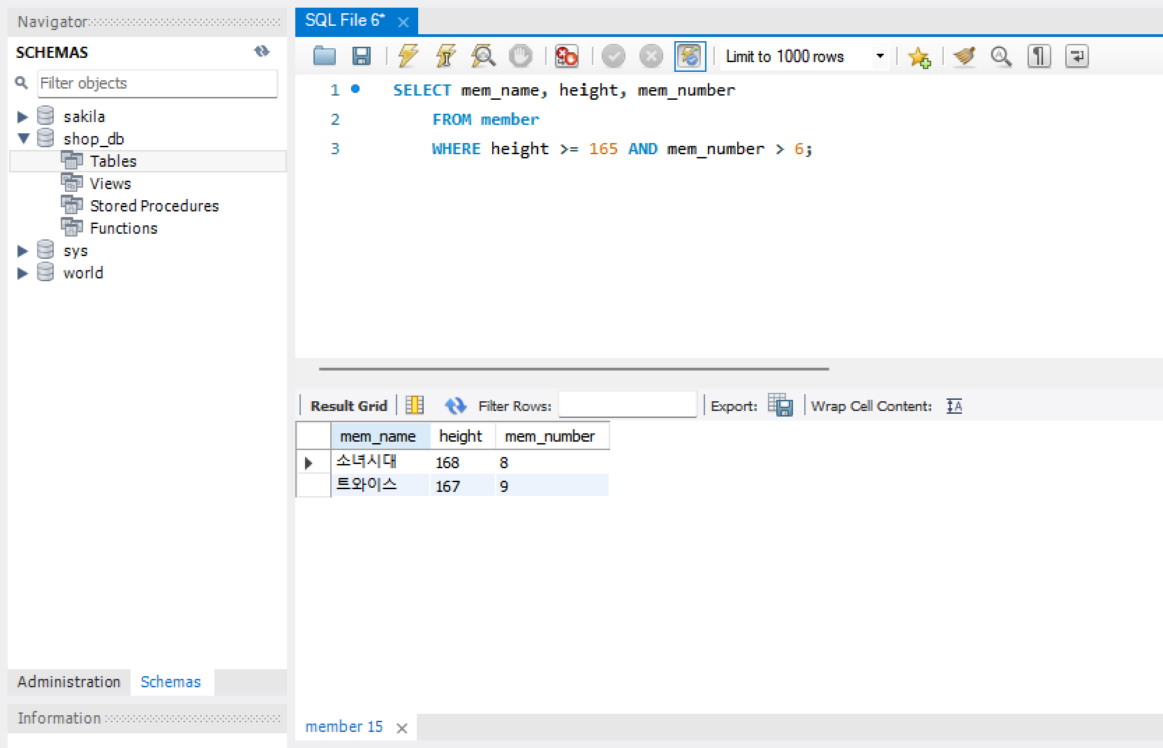 1) 평균 키 165 이상이면서 인원도 6명 초과인 회원 조회와 같이 2가지 이상의 조건을 만족하도록 하기 위해서 논리 연산자 AND를 사용해 조회할 수 있음.