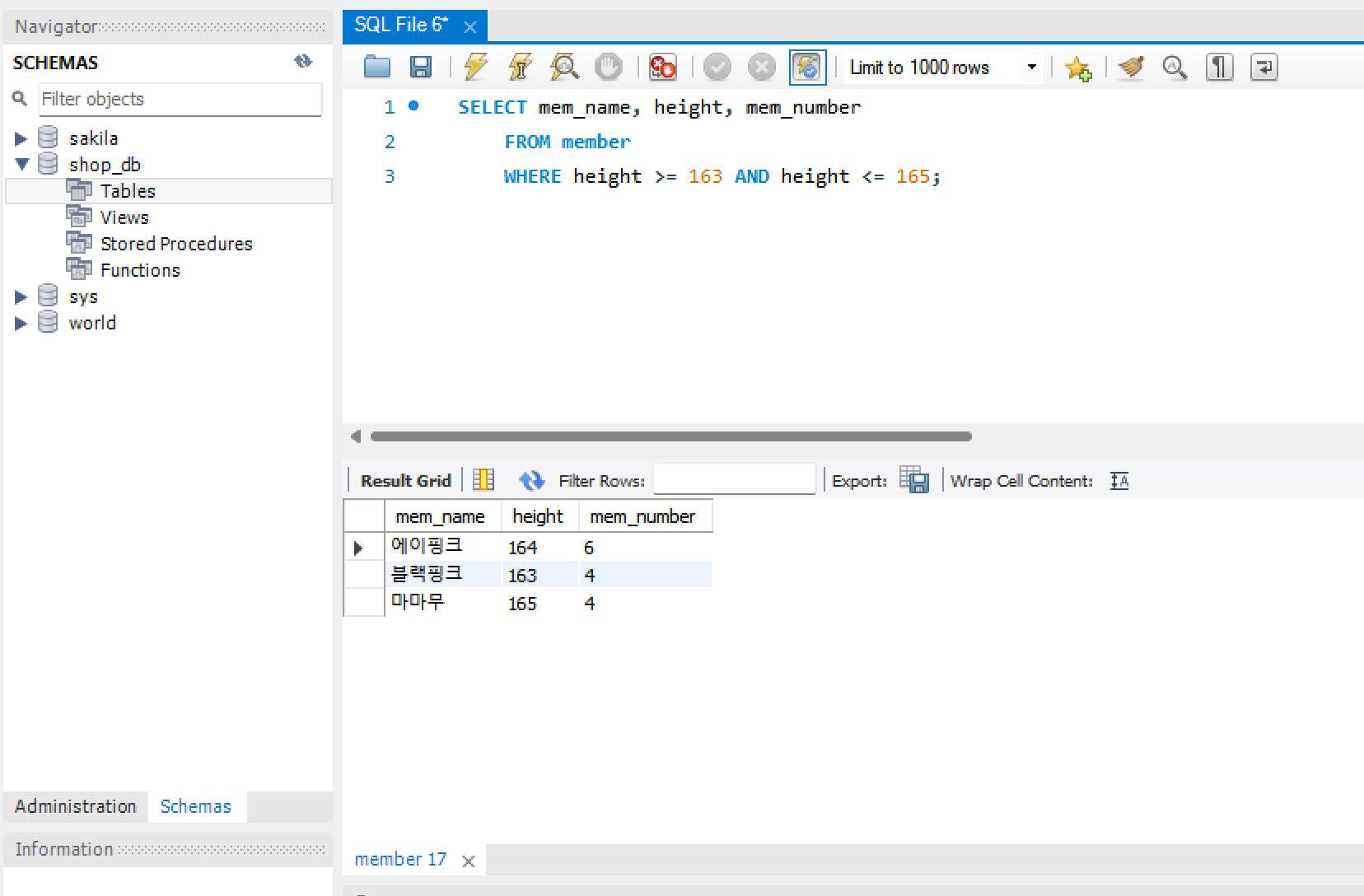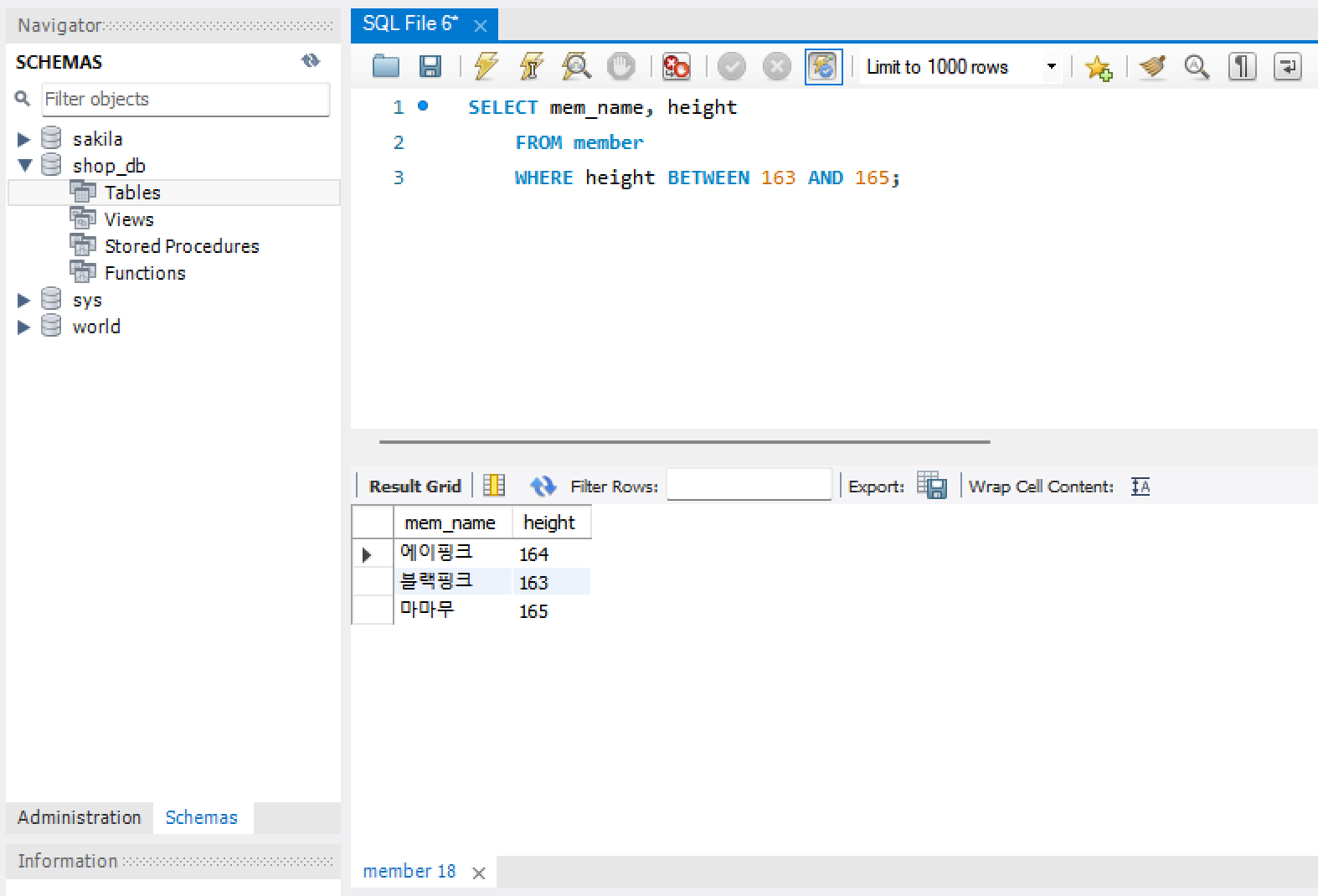 AND를 사용하여 평균 키가 163~165인 회원 조회하기