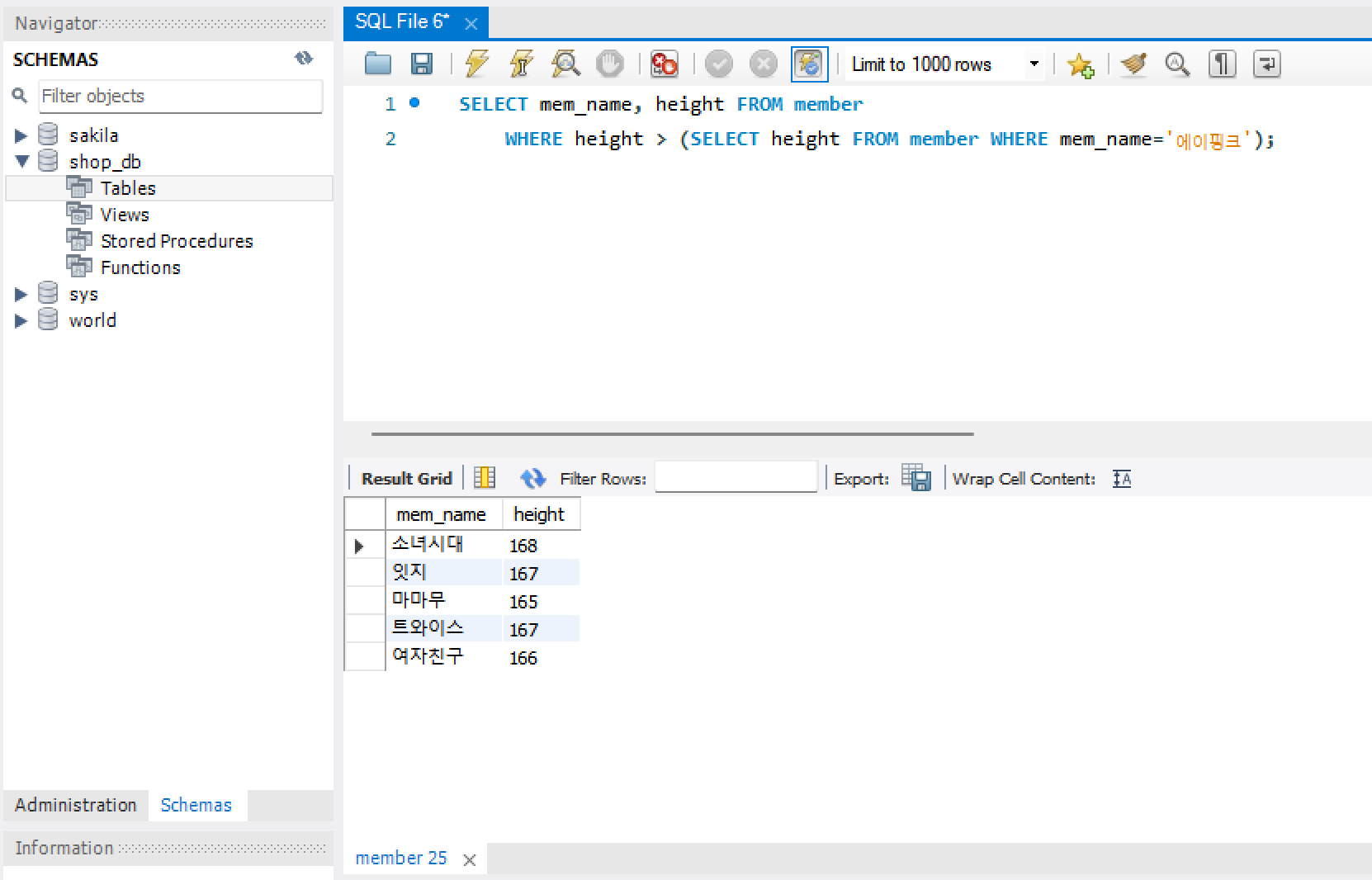 이름이 '에이핑크'인 회원의 평균 키보다 큰 회원 검색하기