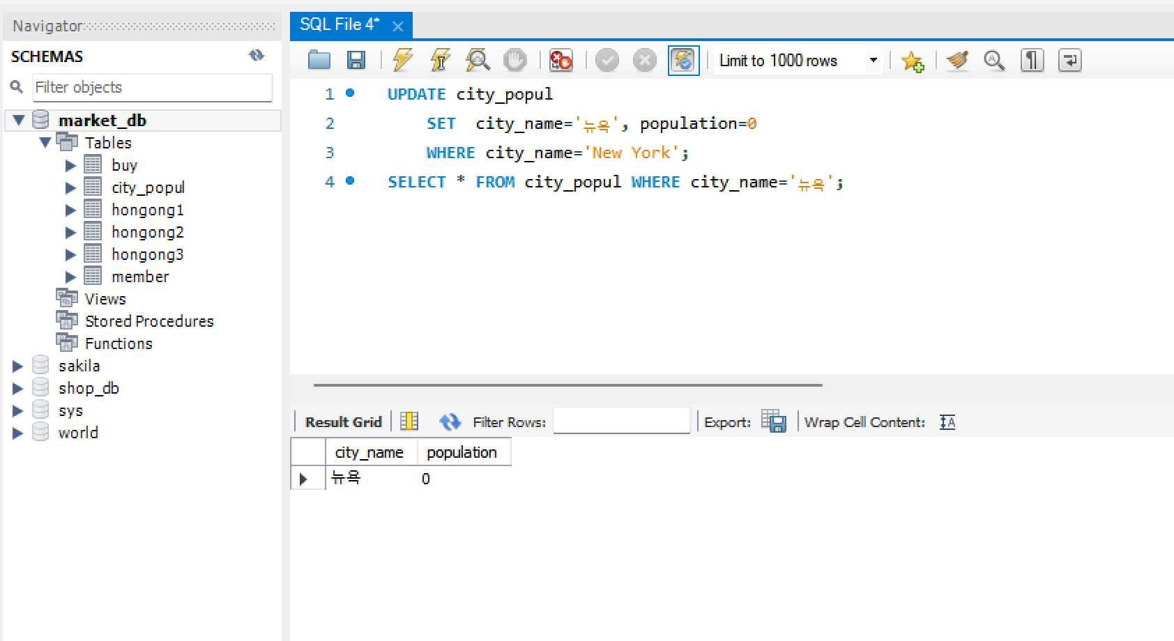 2) 다음 SQL은 도시 이름(city_name)인 'New York'을 '뉴욕'으로 바꾸면서 동시에 인구(population)을 0으로 설정하는 내용임.
