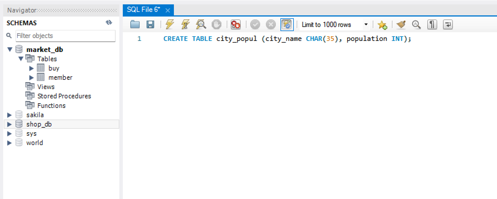 도시 이름과 인구를 가져오기 위해 먼저 테이블 만들기